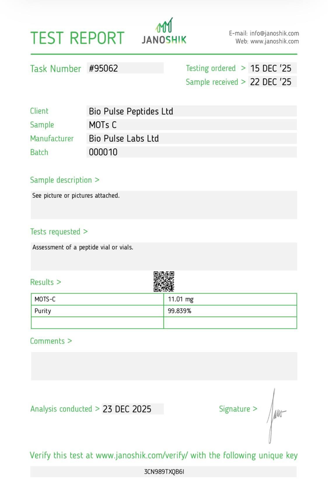 Yes. Batch documentation (e.g., Test Results) is available on request; if it’s not attached below, contact support and we’ll add it to your order.